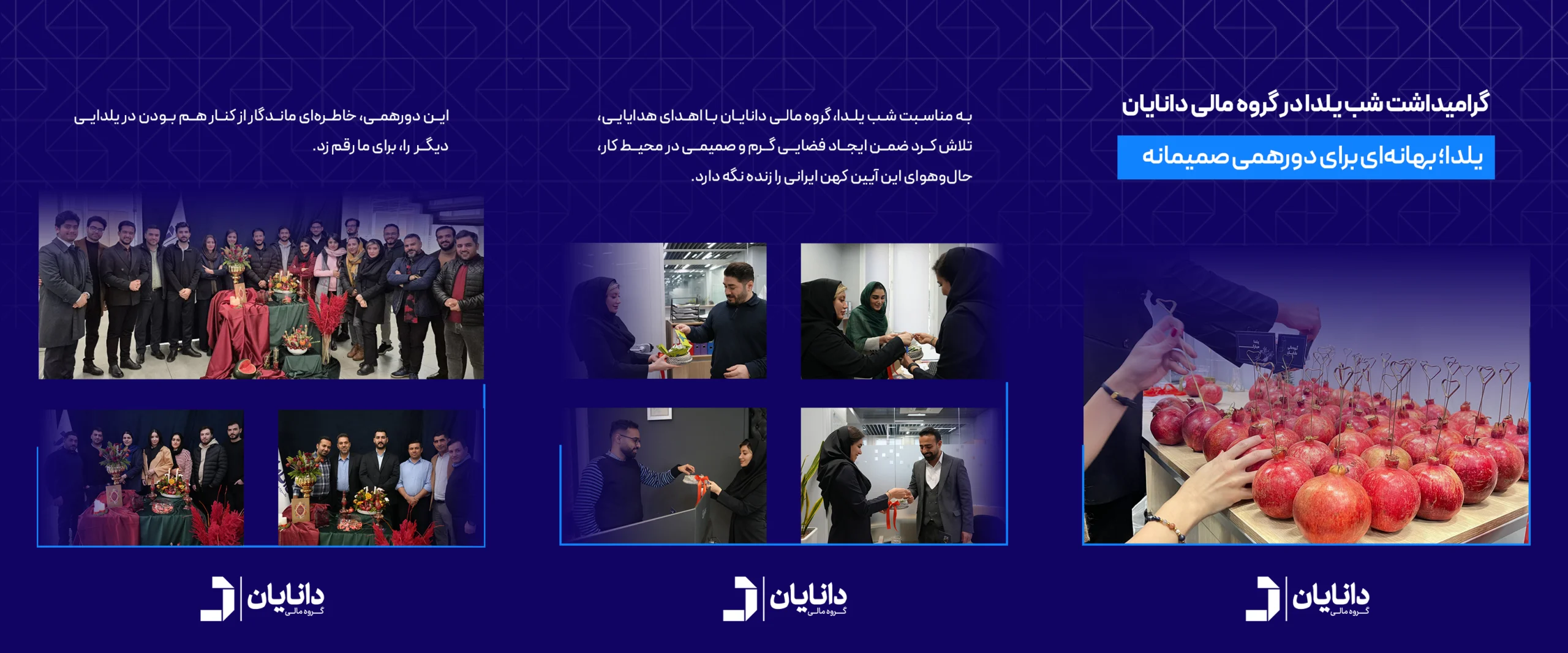 همزمان با شب یلدا، گروه مالی دانایان با چیدن سفره یلدا و ثبت لحظههای گرم و شیرین در کنار همکاران، این مناسبت ایرانی را در فضایی صمیمی و دوستانه برگزار کرد. این دورهمی یلدایی فرصتی برای گفتوگو، همدلی و تقویت روابط میان اعضای مجموعه بود و حالوهوایی گرم و خانوادگی را در محیط کار رقم زد.