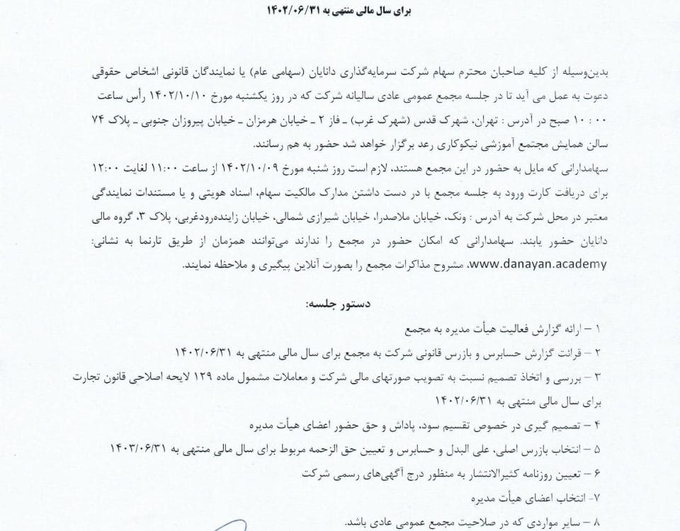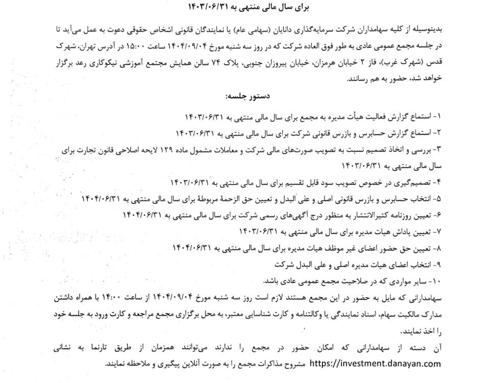آبان 20, 1404منتشر شده توسط Ali Dezhami در آبان 20, 1404دسته بندیها سرمایه گذاریآگهی دعوت به مجمع عمومی عادی سالیانه صاحبان سهامبدینوسیله از کلیه صاحبان محترم سهام شرکت سرمایهگذاری دانایان (سهامی عام) یا نمایندگان قانونی اشخاص حقوقی دعوت به عمل میآید.